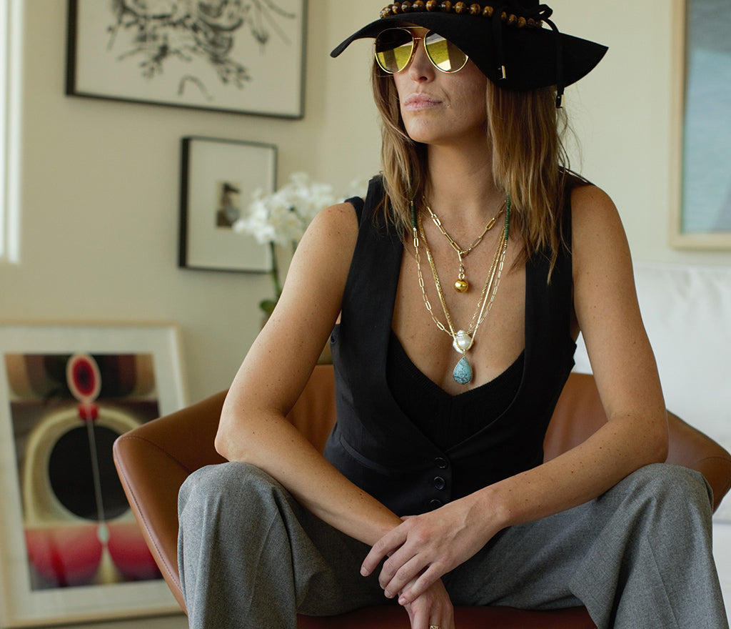 Relaxed and always stylish Ingrid couples her tee and linen skirt with a go-to hat and soft boots for an effortlessly chic look. What sets her apart? Jeuje accessories and fine jewelry including: our Hat Band in Tiger's Eye, Baroque Pearl Drop Earrings, Turquoise Crossbody, 14k Gold Paperclip Chain with both the Large Diamond Disk and Baroque Pearl Pendants, our modern Spurs in Fancy Tiger's Eye and finally she double-wraps an 18" handbag strap in Majorca White Pearl around her wrist to complete her look.